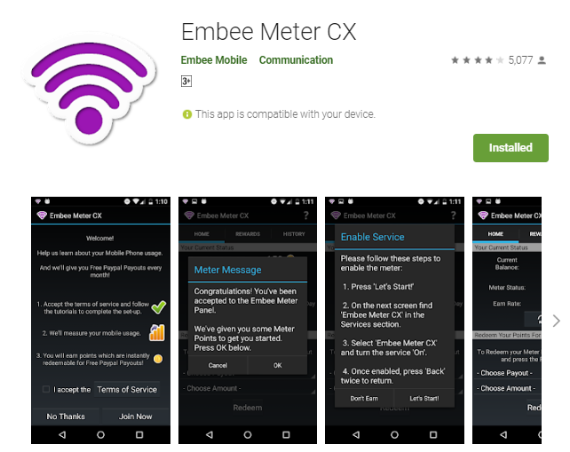 Embee Meter adalah satu aplikasi yang berjalan secara pasif di dalam sesebuah smartphone. Aplikasi ini memberikan anda ganjaran yang menarik dan ganjaran utama ialah kredit/prepaid. Ia juga merangkumi beberapa negara dan semestinya termasuk Malaysia (celcom,digi,tunetalk,umobile,maxis)